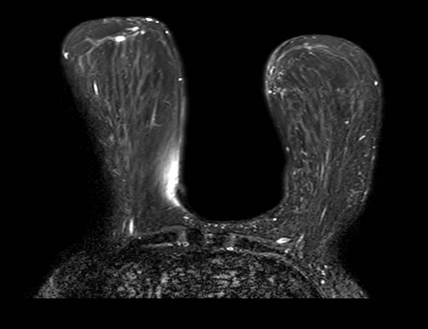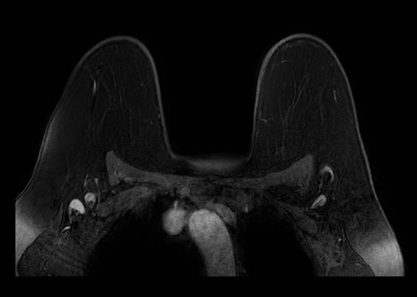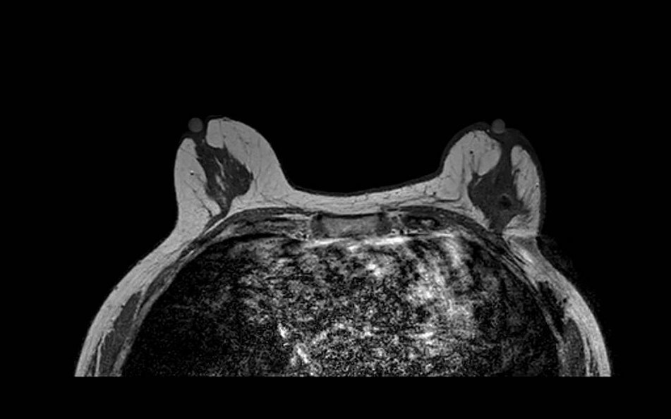 Diffuse fatty breast composition mimicking fat suppression failure. Axial fat-saturated T1-weighted image in a patient with almost entirely fatty breast composition. The near-complete absence of fibroglandular tissue results in a predominantly dark image that may be misinterpreted as global fat saturation failure. Careful assessment of subcutaneous fat signal and chest wall musculature helps distinguish true failure from extreme fatty composition.