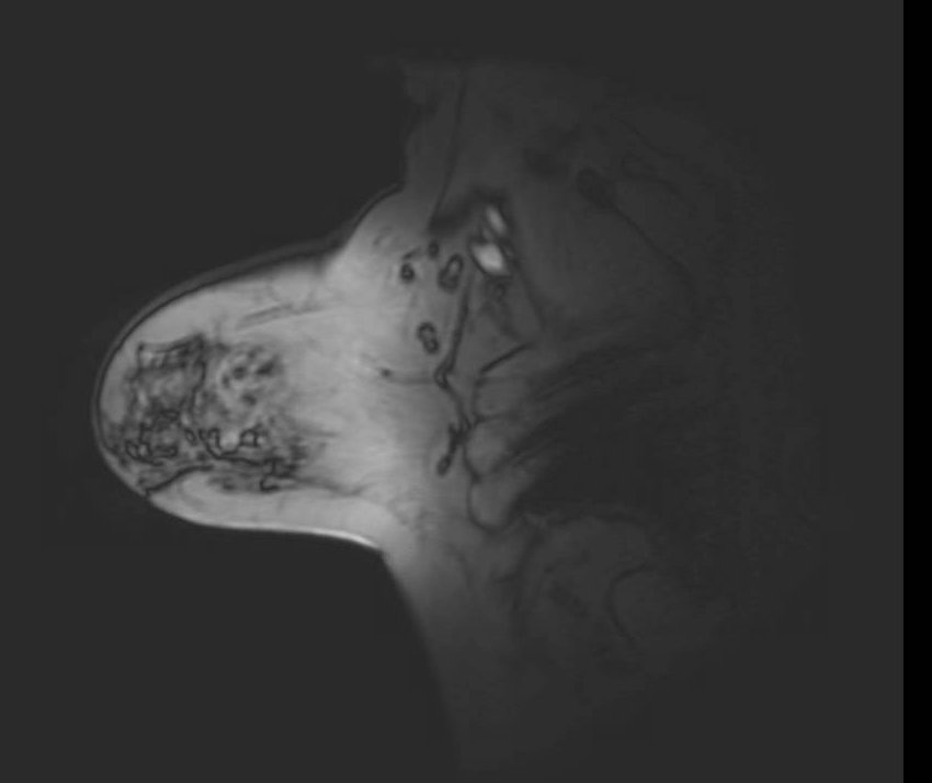 Aliasing artifact: sagittal plane. Sagittal image demonstrates wrap-around of the contralateral breast into the image in the phase-encode direction. The left-right wrap reflects that the prescribed FOV in this plane was insufficient to encompass both breasts, causing the out-of-field breast to alias into the image. Recognition requires identifying the anatomically misplaced structure and its reflection geometry relative to the FOV edge.