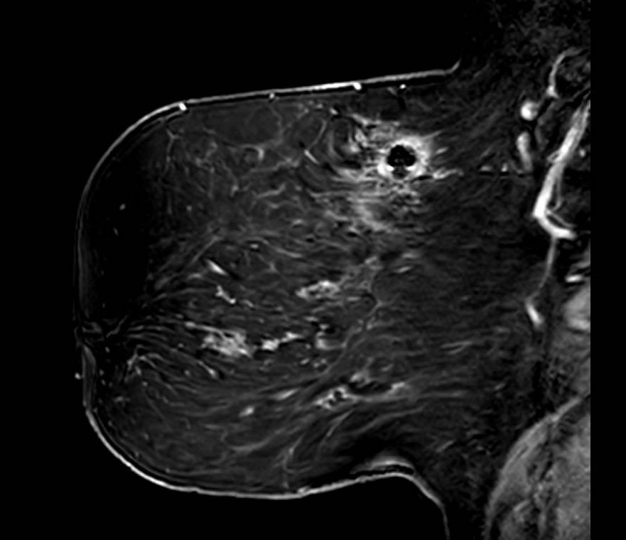 Beyond the focal signal void, metallic hardware can cause broader effects on image quality. Field distortion from a port or large clip may disrupt fat saturation throughout the adjacent breast, even in regions distant from the hardware itself.