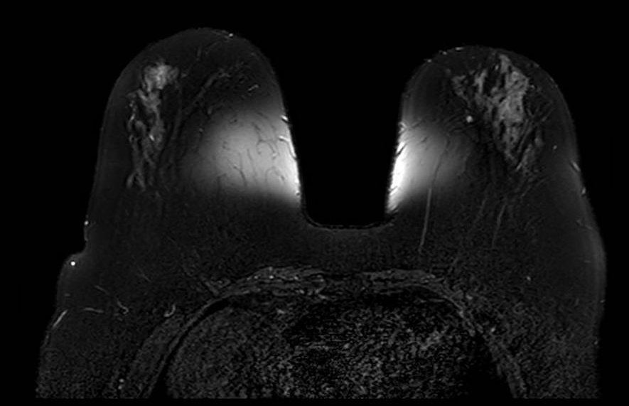 Bilateral asymmetric fat suppression failure on T2-weighted fat-saturated sequence. The pattern of inhomogeneous suppression differs between breasts, reflecting spatial variation in B0 across the imaging volume. Fat-saturated T2 sequences are particularly sensitive to field inhomogeneity given their longer echo times and narrower spectral selectivity.